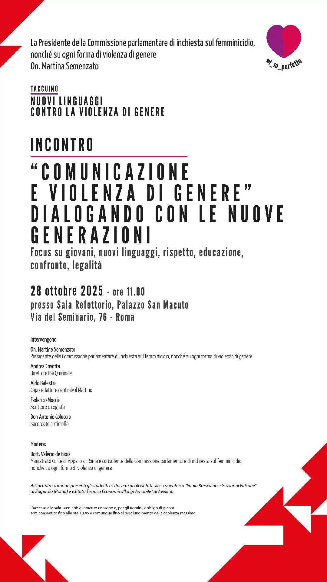 Oggi, nella splendida cornice di Palazzo San Macuto a Roma, i ragazzi della IIIC e VA del nostro Liceo, accompagnati dalla Dirigente, Manuela Cenciarini, e dai loro insegnanti prof. Zappia, prof.ssa Minotti e prof.ssa Taraborrelli, hanno partecipato alla giornata di studi promossa dall’onorevole Martina Semenzato, presidente della Commissione parlamentare di inchiesta sul femminicidio. L’evento, che rientra in un ciclo di appuntamenti sui “nuovi linguaggi contro la violenza di genere” è stato incentrato sulla necessità di contrastare in ogni ambito culturale (da quello della giustizia a quelli della comunicazione istituzionale, dell’informazione giornalistica e dei social media, dell’espressione artistica e dell’impegno civile) la violenza di genere, riappropriandoci del senso più autentico della parola “amore” e dando reale concretezza, nella pratica delle relazioni umane, a concetti quali “rispetto”, “cultura” ed “educazione sentimentale”. Sono intervenuti all’incontro Andrea Covotta, direttore Rai Quirinale, Aldo Balestra, caporedattore centrale del quotidiano Il Mattino, Federico Moccia, scrittore e regista, Don Antonio Coluccia, sacerdote antimafia e Valerio de Gioia, magistrato della Corte di Appello di Roma e consulente della Commissione parlamentare d’inchiesta sul femminicidio e la violenza di genere, che ha svolto anche il ruolo di moderatore. Al termine degli interventi i ragazzi, principali destinatari di questo importante progetto culturale e formativo, si sono inseriti nel dibattito ponendo domande e offrendo ulteriori spunti di riflessione. La conclusione comune, come ha sottolineato l’onorevole Semenzato, è che l’amore è un valore assoluto, esperienza fondamentale della vita di ognuno, un’esperienza a cui ci auguriamo che i giovani si aprano con gioia e pienezza ma anche con la consapevolezza che amare implica il rispetto assoluto dell’altro e che l’amore continua ad essere un sentimento che ci migliora e ci arricchisce, anche quando comporta la sofferenza di un no.